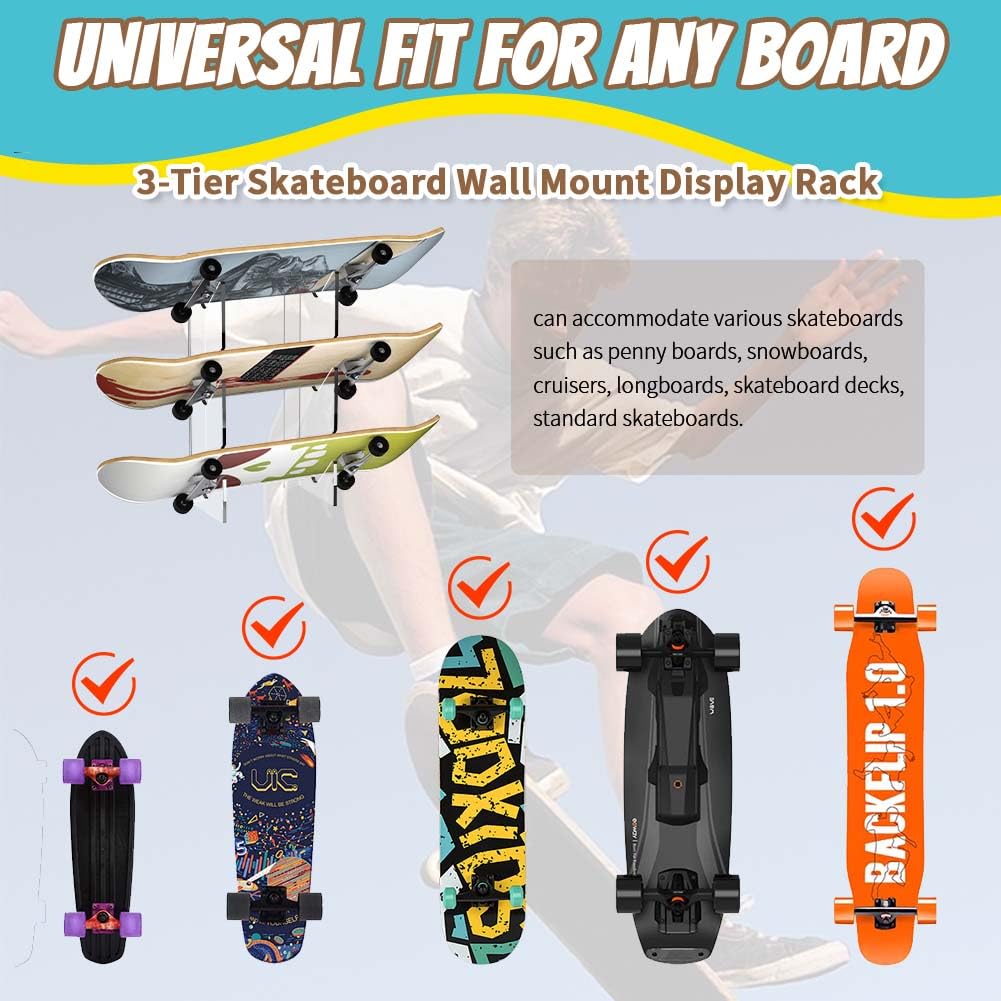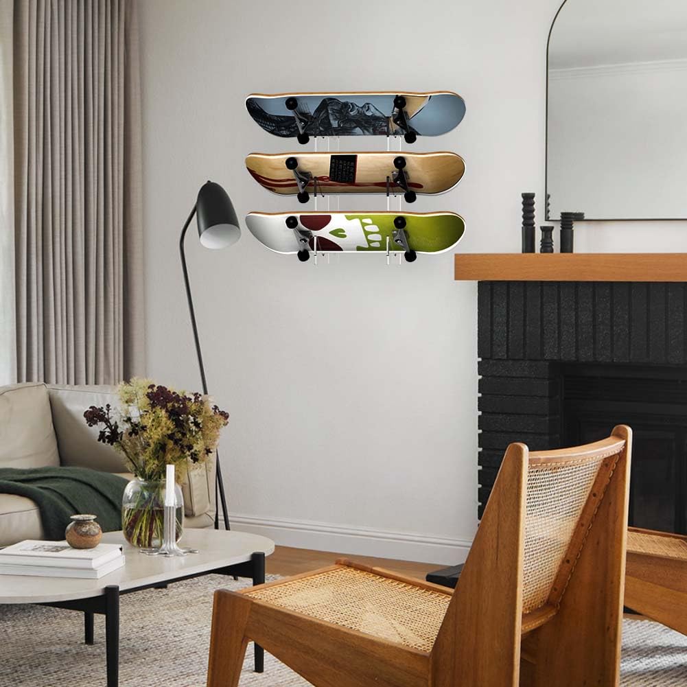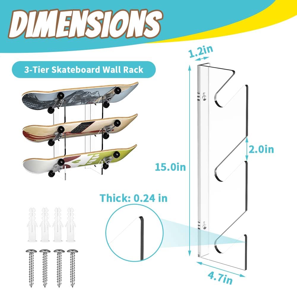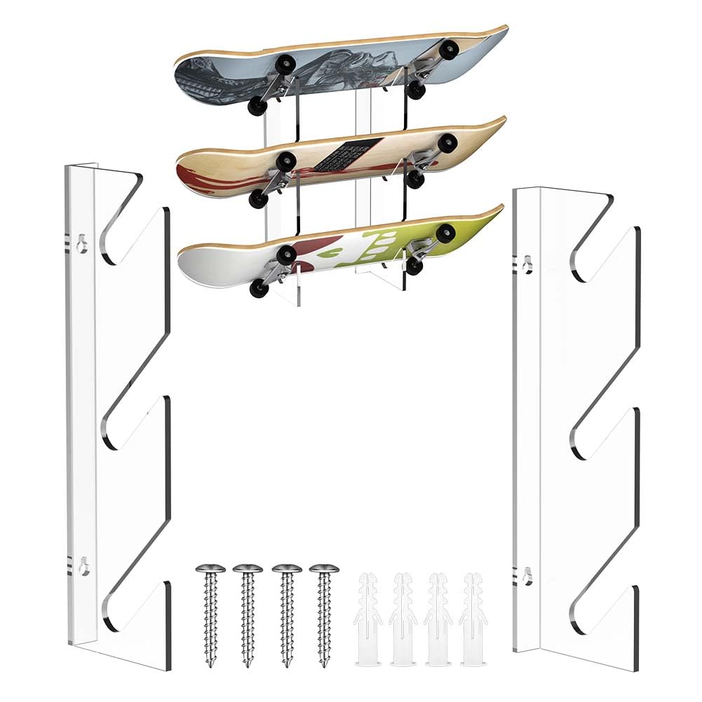 Acrylic 3 Skateboard Display Rack - Wall Mounted Horizontal Skateboard Rack