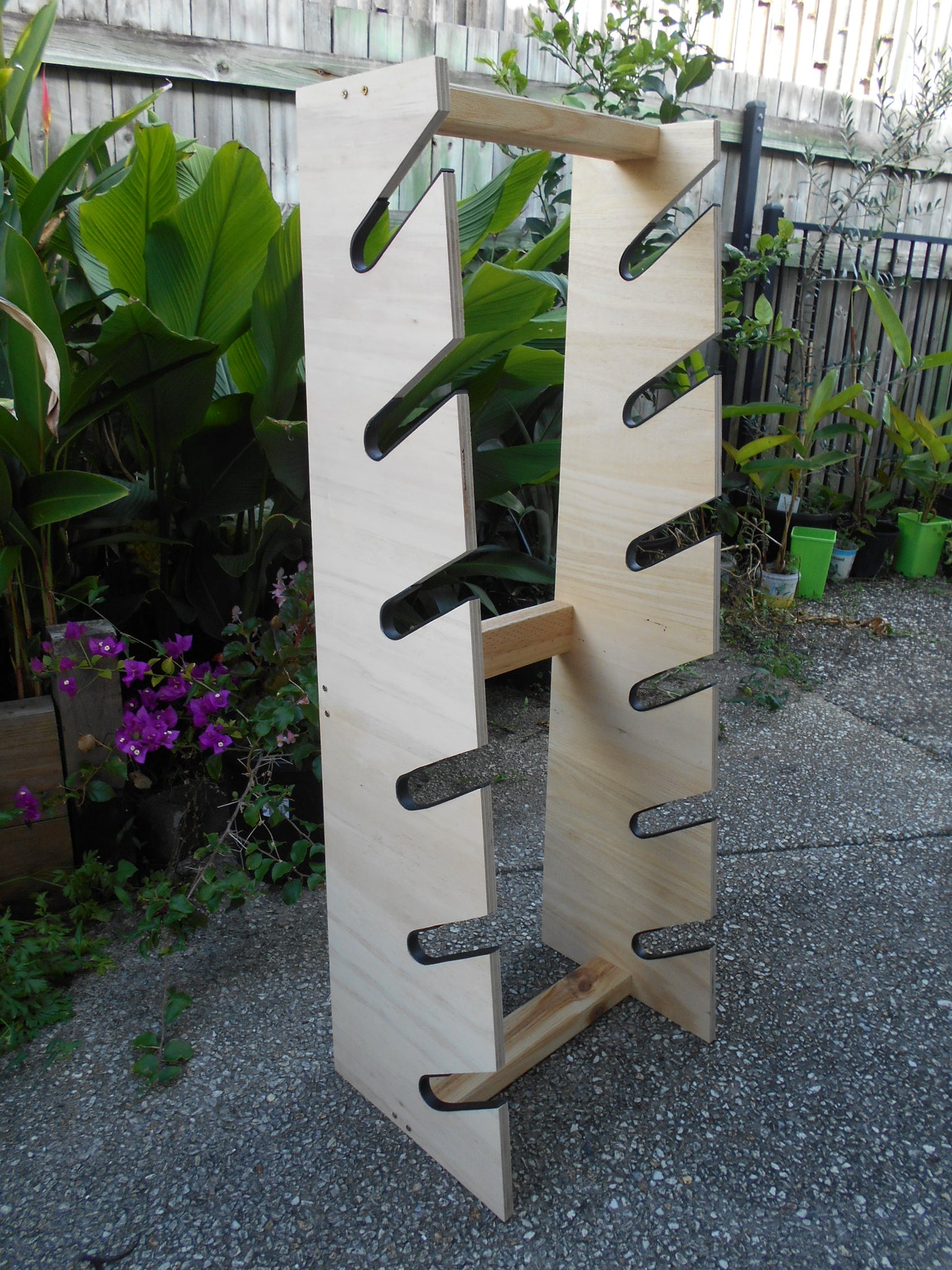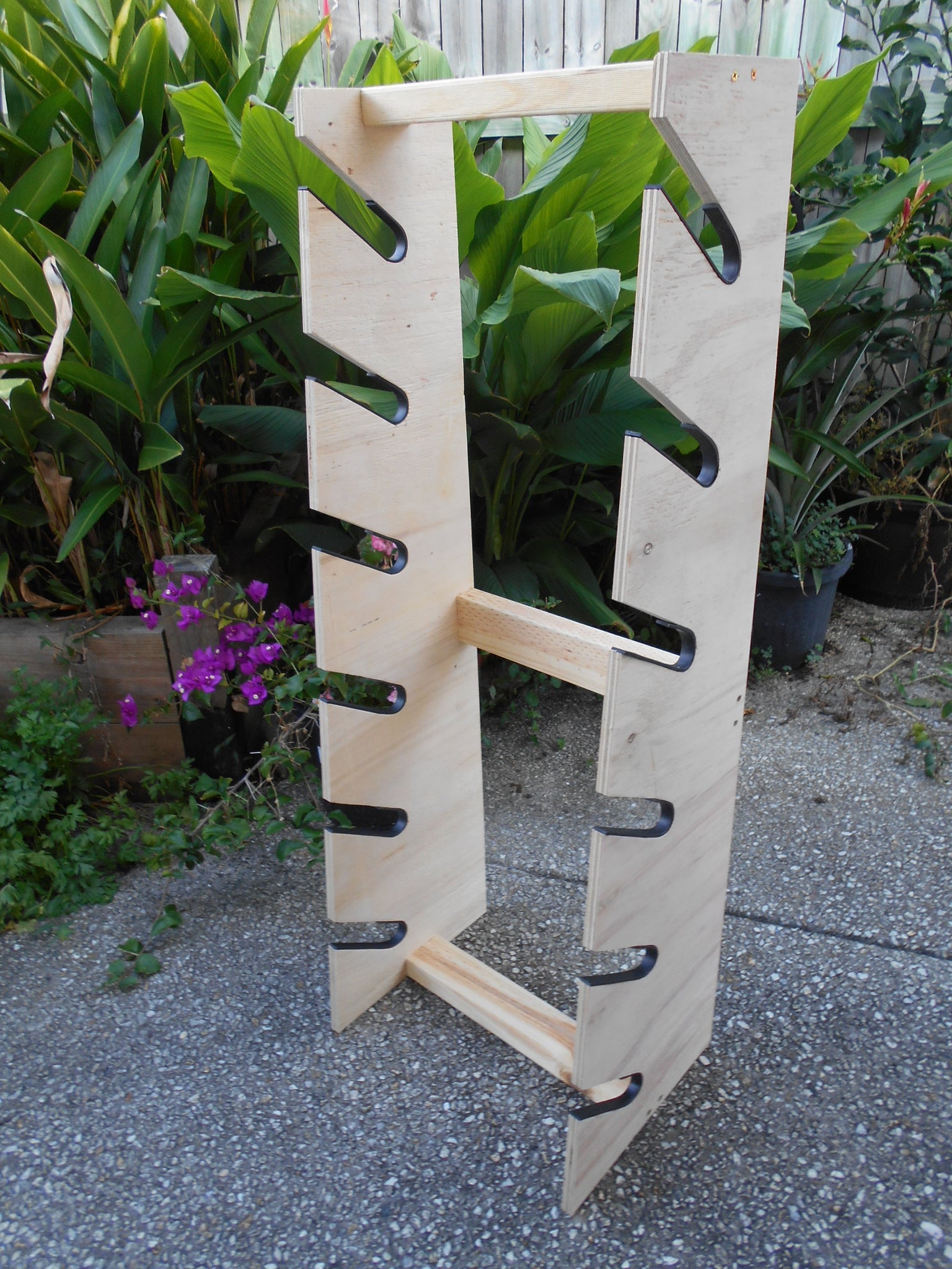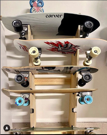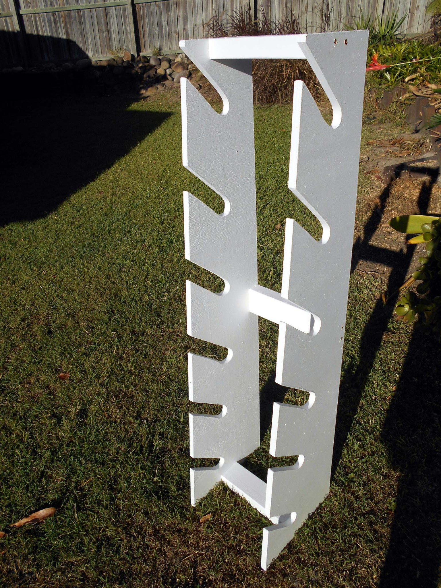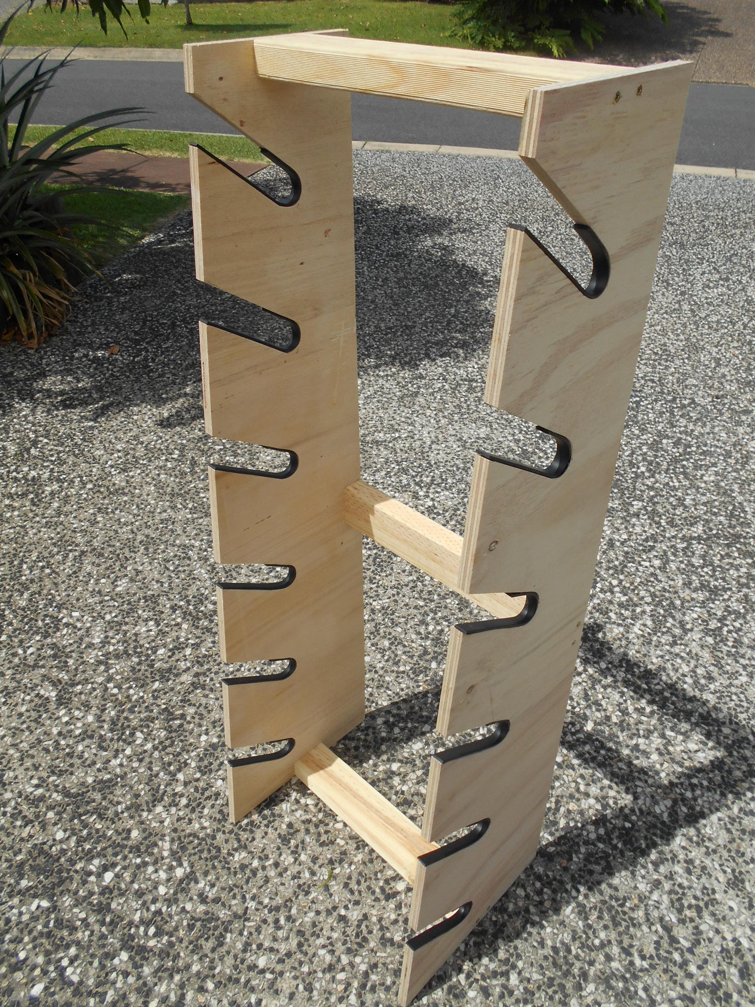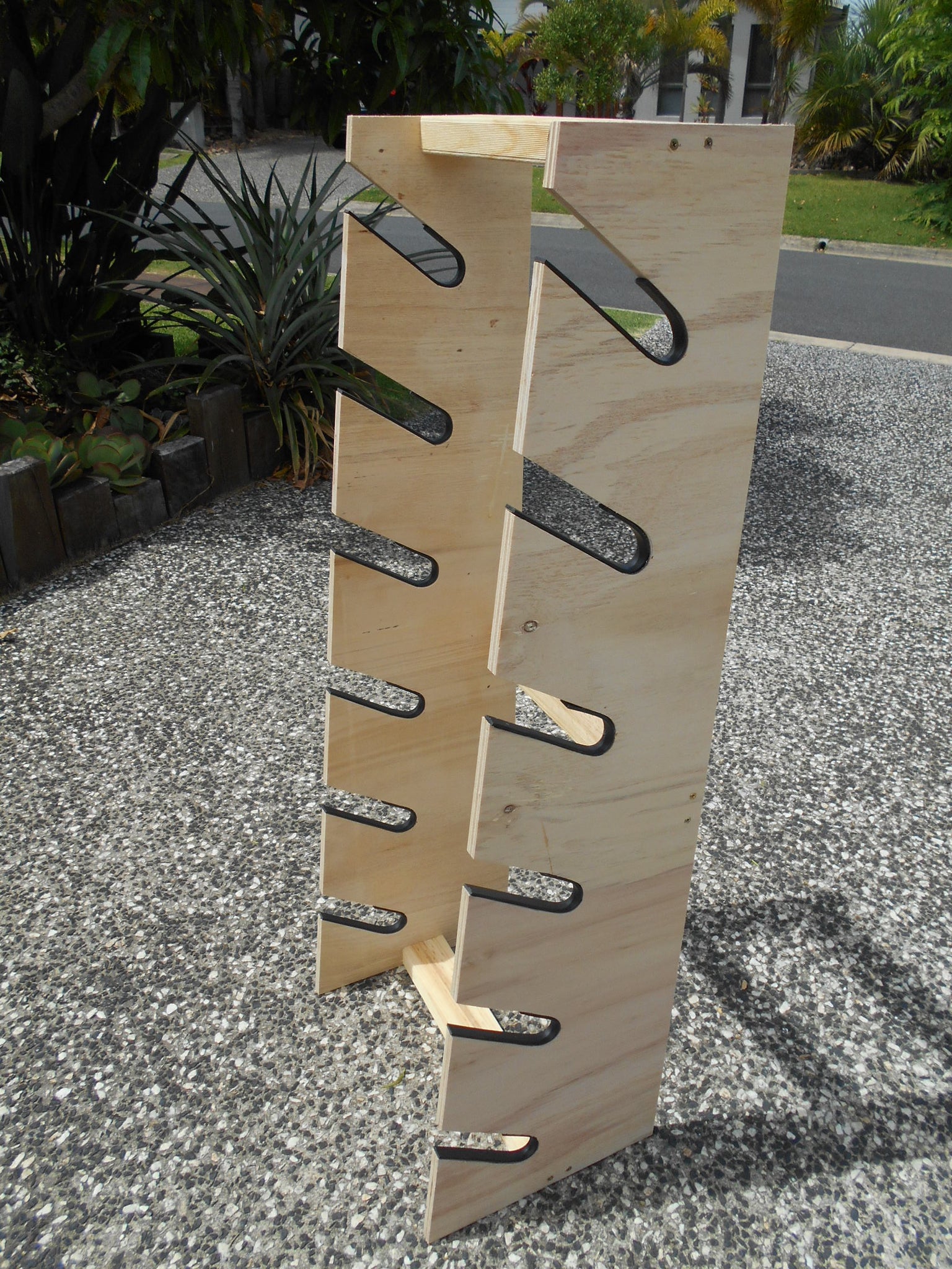 The Surf Skate 6 Deck Rack is designed for storing your large surf skateboards. It is a freestanding rack. It is made from 15mm structural plywood and solid pine supports. Dimensions: 120cm tall, 28cm wide, 32.5cm deep. The gaps are 4cm tall and the shelf height is 15cm. It has a raw finish. It does not include the rubber lining as seen in the picture. The skateboard rack will be assembled and unassembled to predrill and mark pieces for easy assembly at home. The screws and instructions are supplied. (Note: Sunshine Coast customers will have this rack fully assembled upon delivery or pickup)
