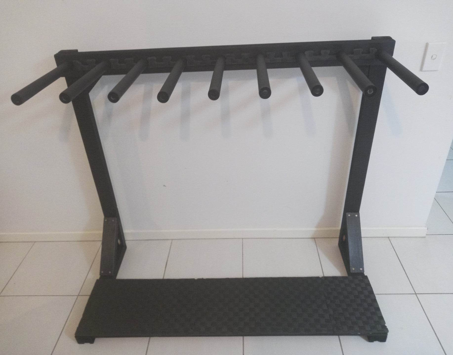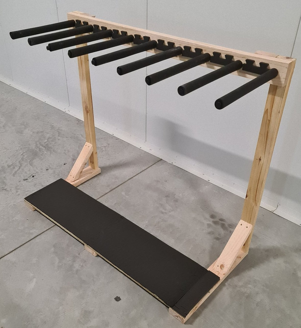 Eco Racks are lovingly handmade from reclaimed, recycled, and sustainable timbers and paint on the Sunshine Coast. Each rack is carefully measured, cut, drilled, screwed, glued, and painted by hand. The poles are made of black powder-coated steel which are then covered using insulation rubber tubing. To further protect your boards, I add thick, black EVA matting to the base and head of each rack to ensure zero scratches.